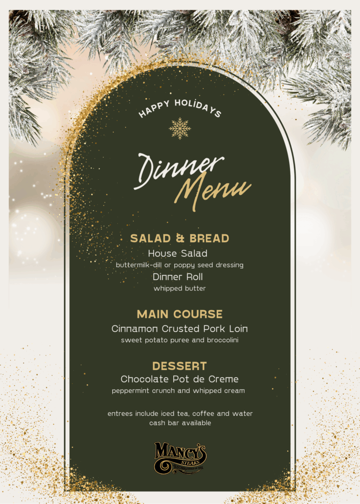 Your ticket also includes a delectable three course dinner, complete with a festive holiday dessert, by Mancy’s Steakhouse and valet parking.