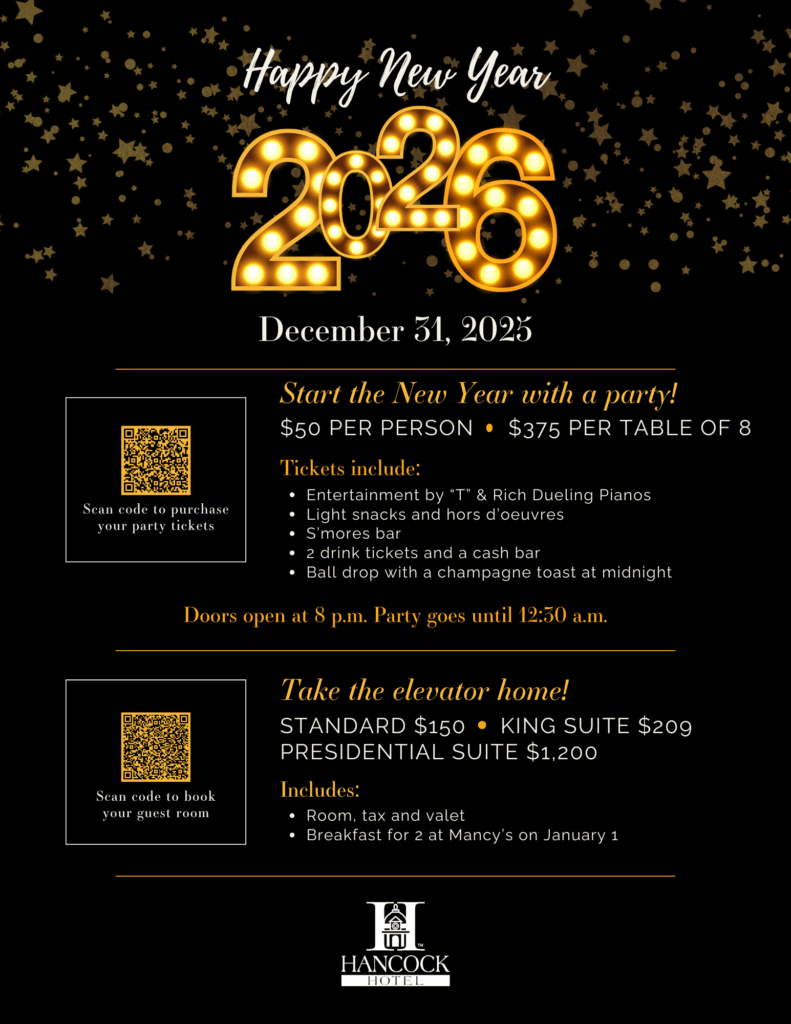 Join us for a night of fun, food and festivities as we ring in the New Year together! Dance the night away with live music by “T” and Rich Dueling Pianos, enjoy two drink tickets followed by a cash bar, light snacks and hors d’oevures, a s’mores bar and countdown to midnight with a champagne toast. Don’t miss out on this epic party to start the new year off right! Grab your friends and get ready for a night to remember at Hancock Hotel! Tickets are $50 per person, or you can purchase your table of 8 for $375. All guests must be 21 years of age or older.